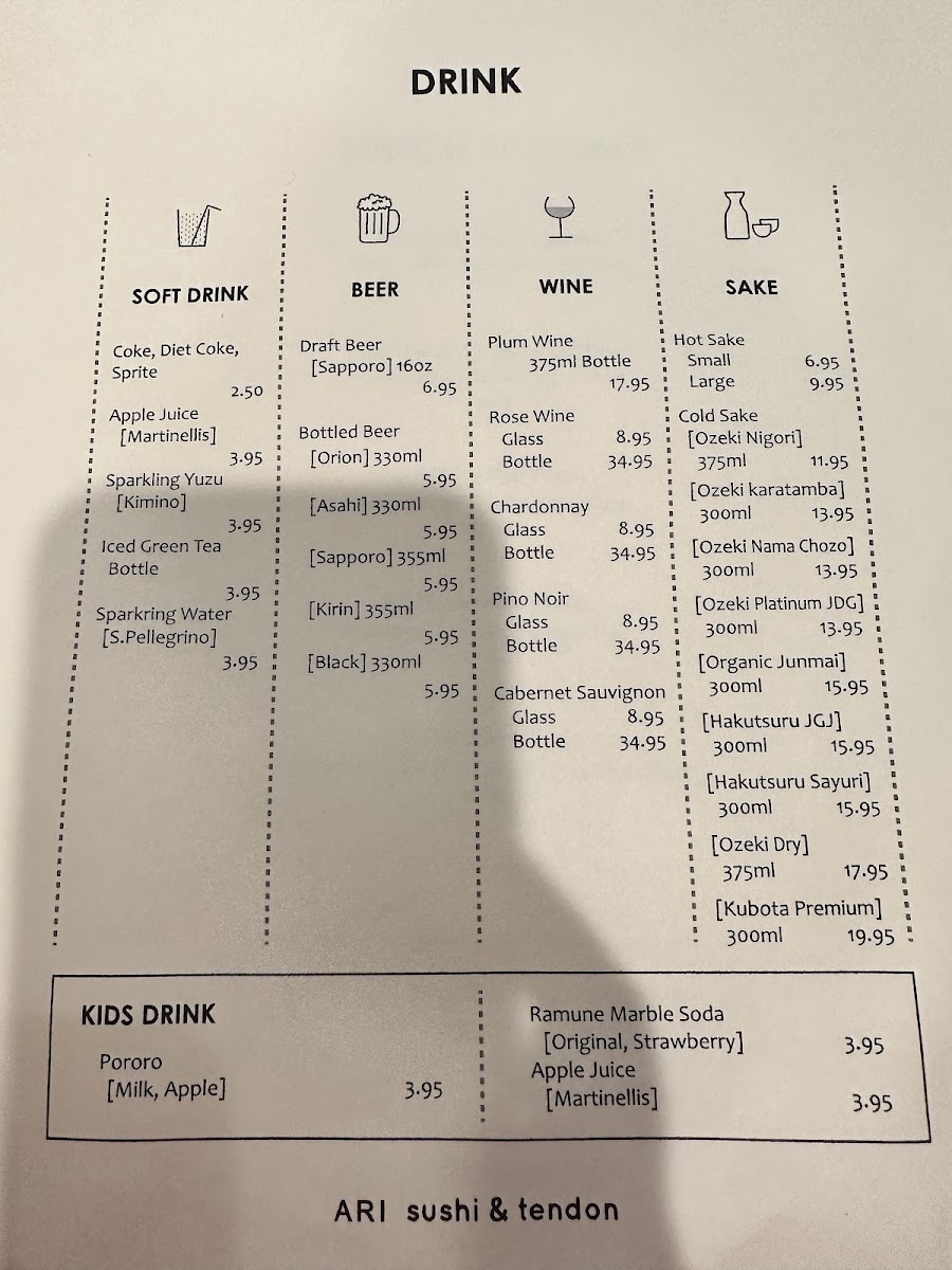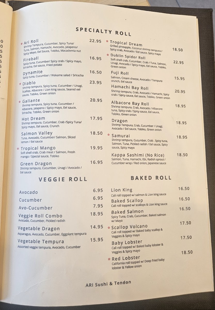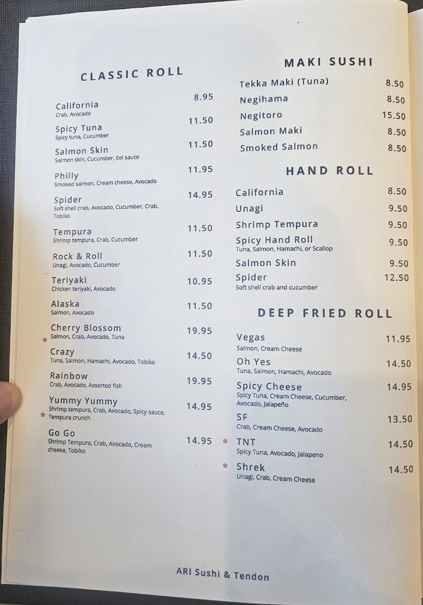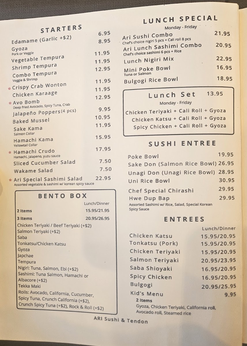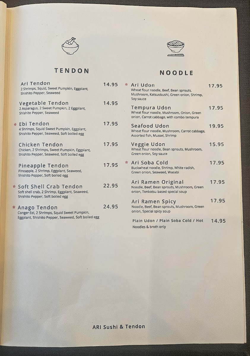 The menu at Ari Sushi & Tendon offers a variety of Japanese dishes that highlight sushi, tendon (tempura rice bowls), and other traditional items. It is organized into clear sections including appetizers, lunch entrees, and maki sushi rolls, providing a diverse selection for different dining preferences and occasions.