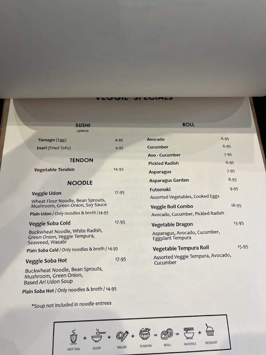Lunch Entrees include options like chicken katsu, beef teriyaki, salmon teriyaki, and various set combinations. These dishes are suitable for more substantial meals during midday or casual dining.