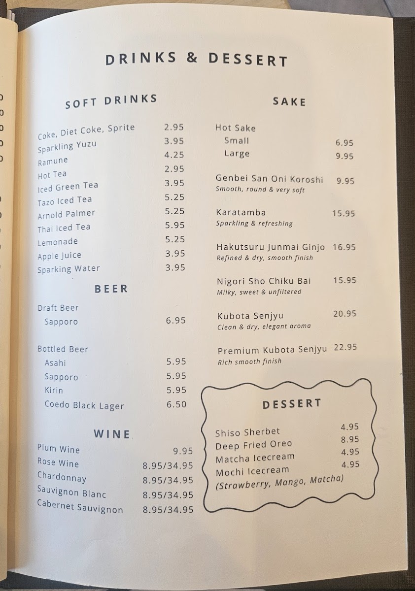 Appetizers feature both seafood and vegetable options such as edamame, veggie tempura, shrimp tempura, gyoza, karaage (fried chicken), and baked mussels. These starters serve well for light bites or sharing before a main course.